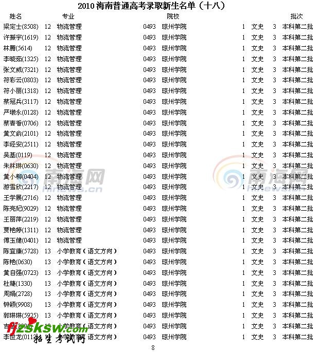 2010年海南省高考录取名单已经开始由海南省考试局陆续公布,今天公布的是2010年海南省普通高考录取新生名单(十八)。