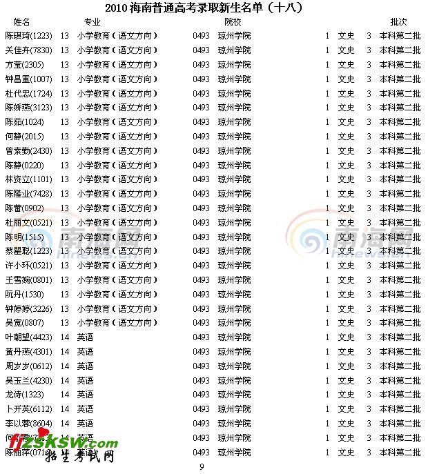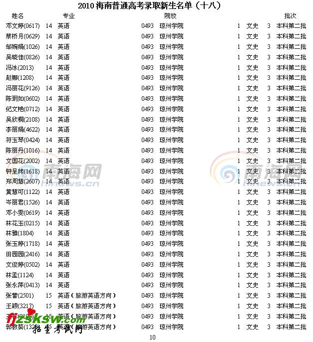 2010年海南省高考录取名单已经开始由海南省考试局陆续公布,今天公布的是2010年海南省普通高考录取新生名单(十八)。