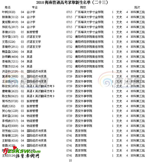 2010年海南高考录取新生名单查询(十)
