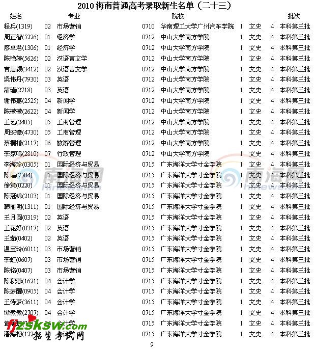 2010海南普通高考录取新生名单(二十三)