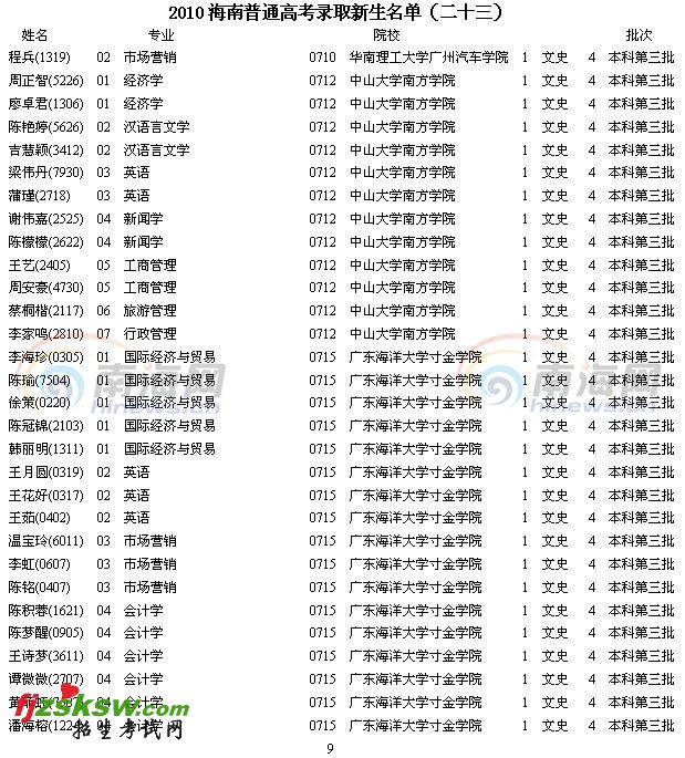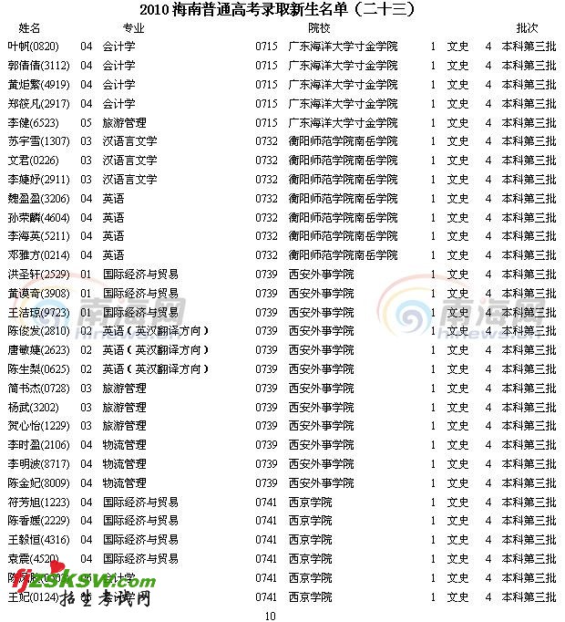 2010年海南省高考录取名单已经开始由海南省考试局陆续公布,今天公布的是2010年海南省普通高考录取新生名单(二十三)。
