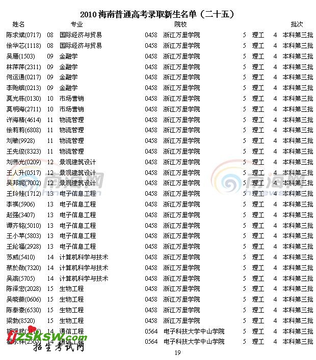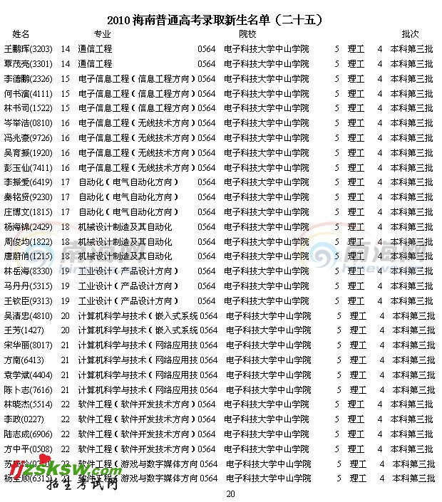 2010年海南省高考录取名单已经开始由海南省考试局陆续公布,今天公布的是2010年海南省普通高考录取新生名单(二十五)。