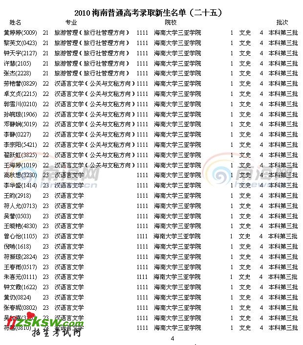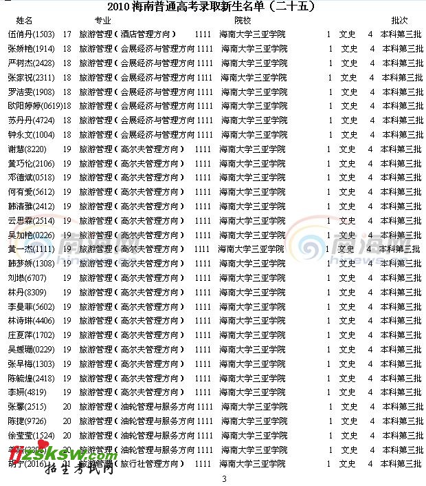 2010年海南省高考录取名单已经开始由海南省考试局陆续公布,今天公布的是2010年海南省普通高考录取新生名单(二十五)。