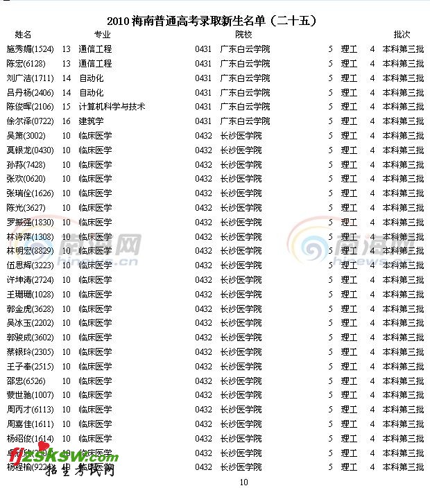 2010年海南省高考录取名单已经开始由海南省考试局陆续公布,今天公布的是2010年海南省普通高考录取新生名单(二十五)。