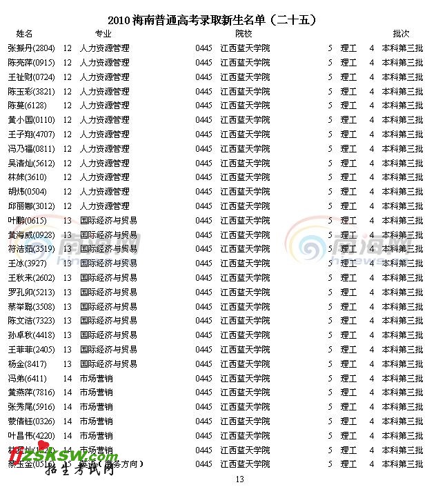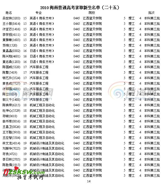 2010年海南省高考录取名单已经开始由海南省考试局陆续公布,今天公布的是2010年海南省普通高考录取新生名单(二十五)。