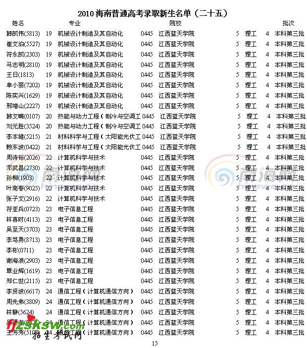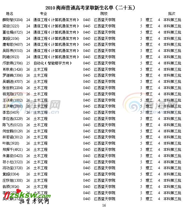 2010年海南省高考录取名单已经开始由海南省考试局陆续公布,今天公布的是2010年海南省普通高考录取新生名单(二十五)。