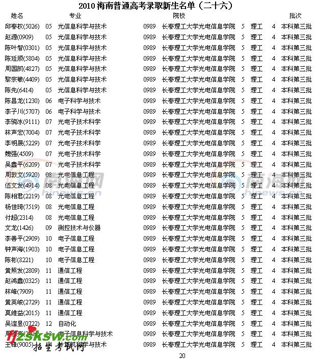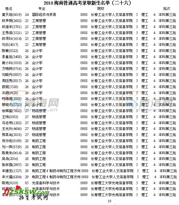 2010年海南省高考录取名单已经开始由海南省考试局陆续公布,今天公布的是2010年海南省普通高考录取新生名单(二十六)。