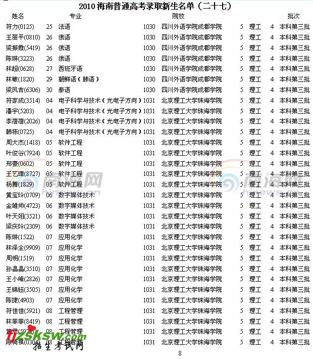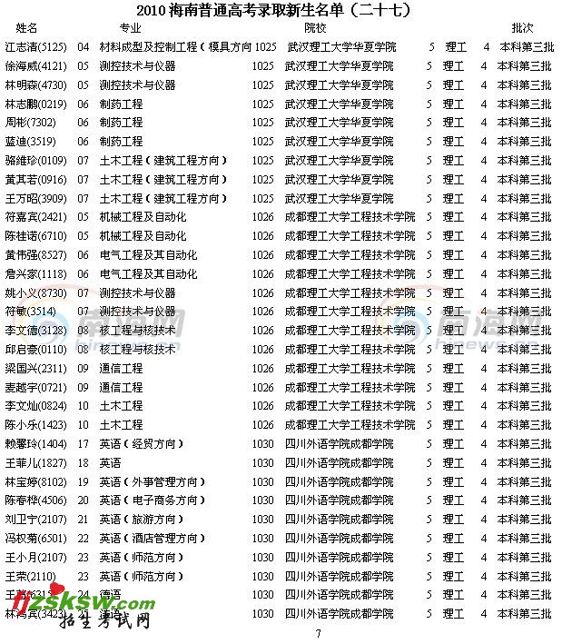 2010年海南省高考录取名单已经开始由海南省考试局陆续公布,今天公布的是2010年海南省普通高考录取新生名单(27)。