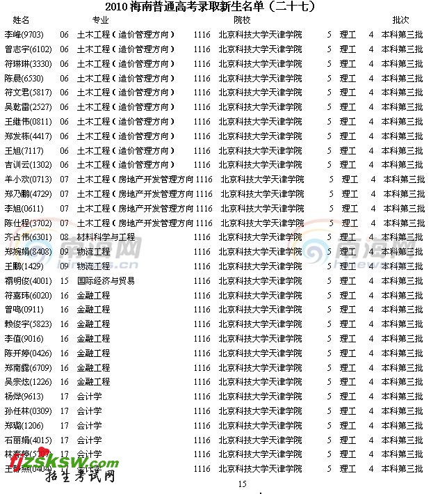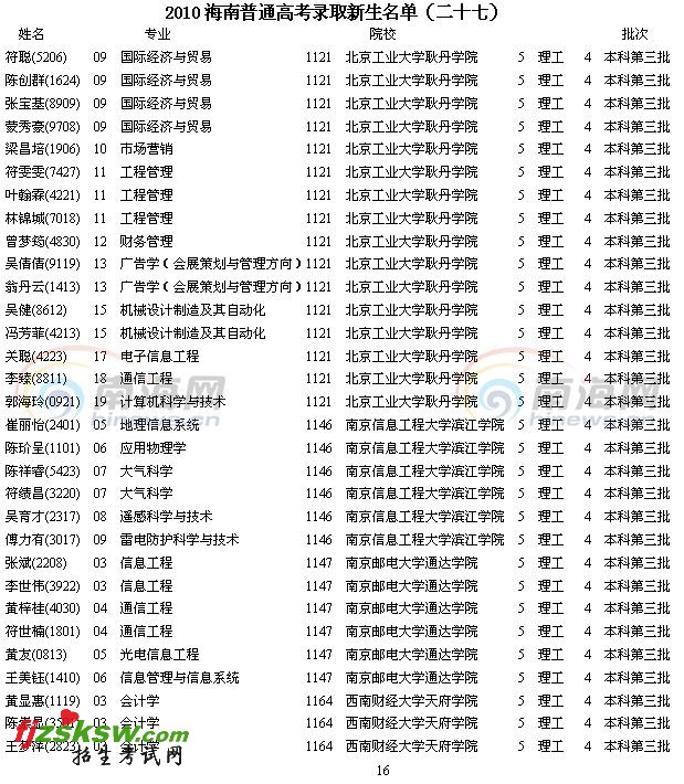 2010年海南省高考录取名单已经开始由海南省考试局陆续公布,今天公布的是2010年海南省普通高考录取新生名单(27)。
