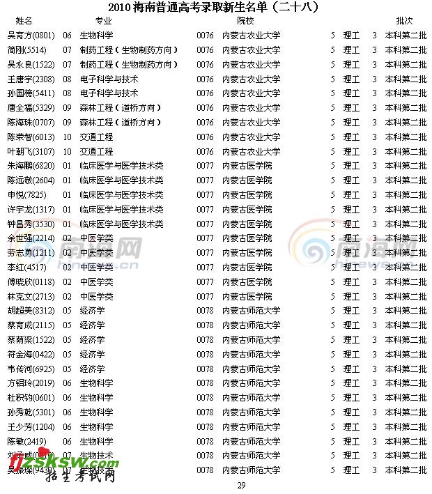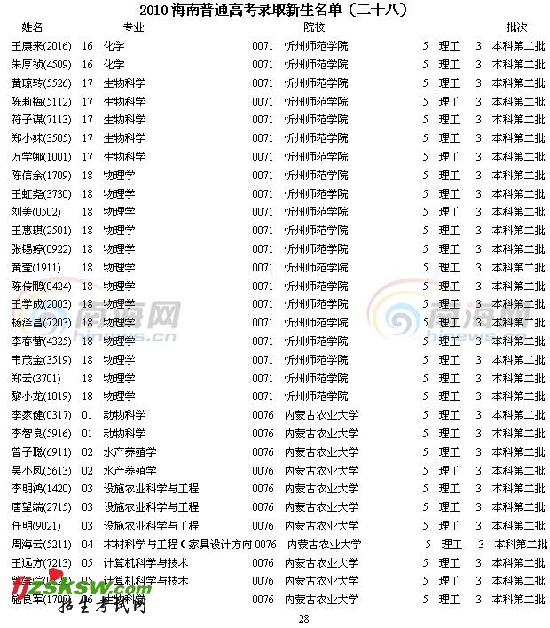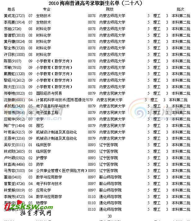 2010年海南省高考录取名单已经开始由海南省考试局陆续公布,今天公布的是2010年海南省普通高考录取新生名单
