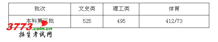 本科第三批文史类的最低控制分数线为525分,理工类的最低控制分数线为495分,体育类的最低控制分数线为412分/73分。