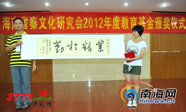 南海网海口8月19日消息(南海网记者秦彦)8月19日,2012年海南省秦氏文化研究会教育基金颁奖暨秦文化研究网开通仪式在海口举行,在今年高考中成绩优秀的47名秦氏子弟喜获奖学金,最高奖学金为23000元。海南省人大常委会副主任、省总工会主席符兴出席并为秦氏子弟颁发奖学金。