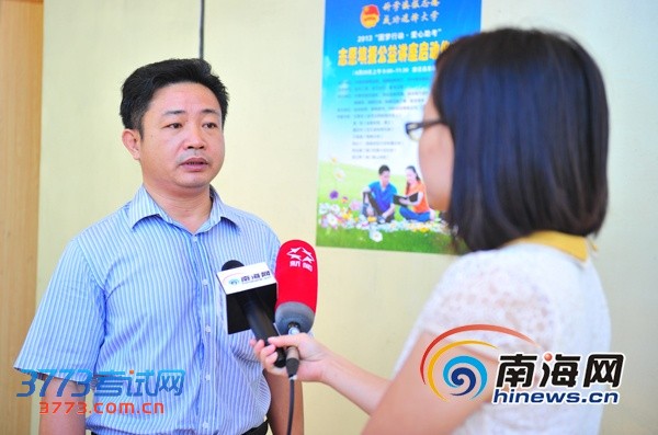 7月28日上午,由南海网等媒体联合共青团海南省委、海南省教育厅、海南省考试局等单位,举办的2013年“圆梦行动爱心助考”高考志愿填报公益讲座在海南澄迈县启动。图为南省青少年事业发展中心主任符文生接受记者采访。(南海网记者秦彦摄)