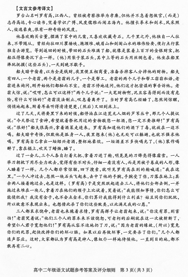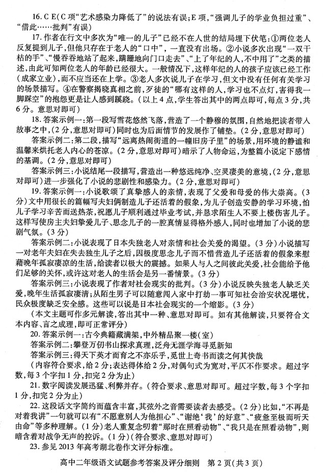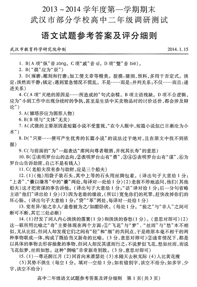 2013~2014学年度第一学期期末武汉市部分学校高中二年级调研测试语文试题参考答案及评分细则