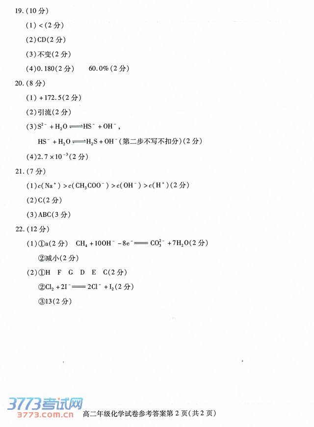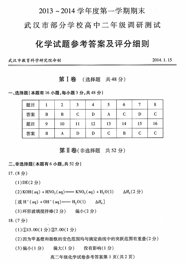 2013~2014学年度第一学期期末武汉市部分学校高中二年级调研测试化学试题参考答案及评分细则 2014武汉高二调考化学试题答案