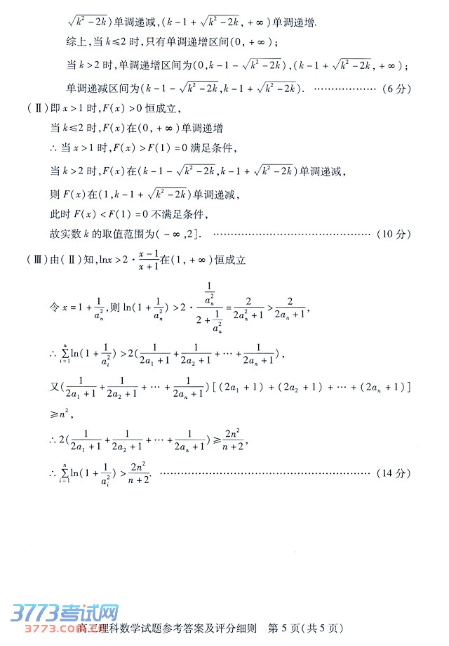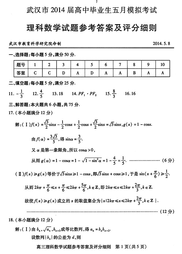 2014武汉高考五月模拟考试数学理科试题答案及评分细则