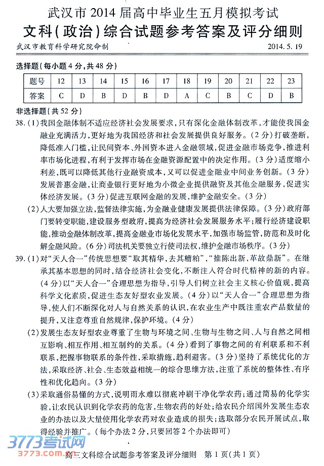 2014武汉高考五月模拟考试数学理科试题答案及评分细则