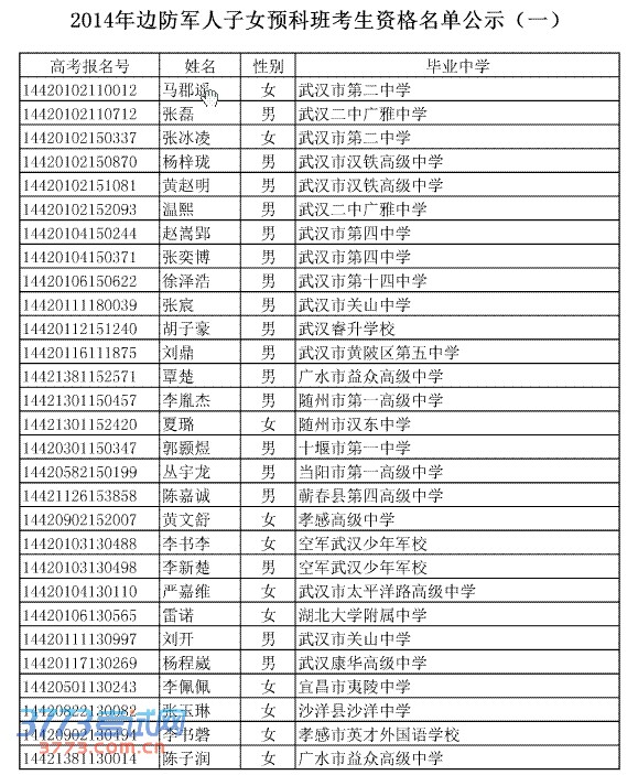 2014湖北高考边防军人子女预科班考生资格名单公示(一)