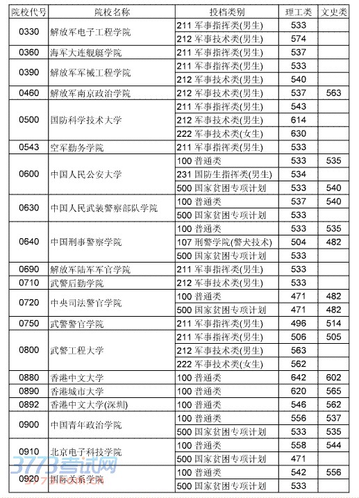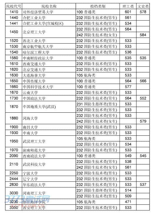 湖北省2014年普通高校招生提前批本科文理类录取院校第一志愿投档线