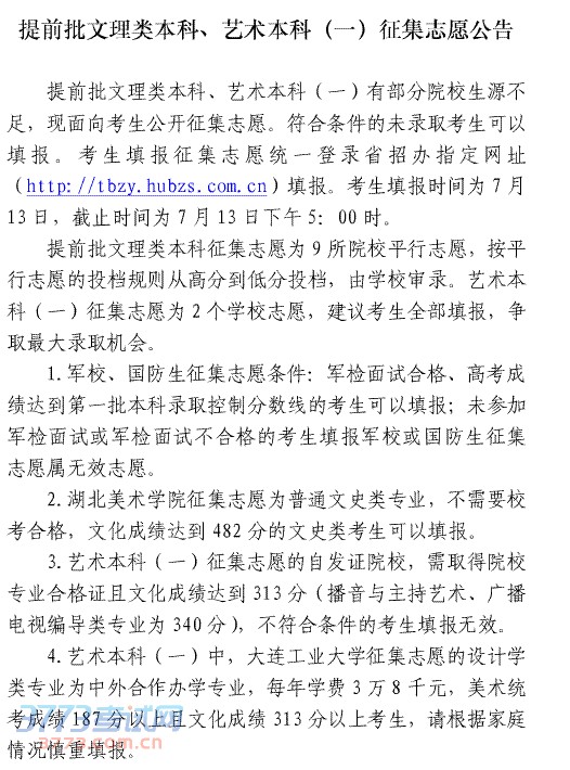 提前批文理类本科、艺术本科(一)征集志愿公告