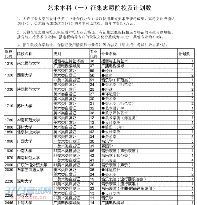2014湖北高考艺术本科一征集志愿院校及计划数