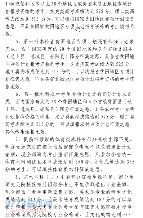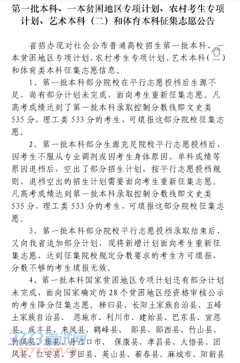 第一批本科、一本贫困地区专项计划、农村考生专项计划、艺术本科(二)和体育本科征集志愿公告