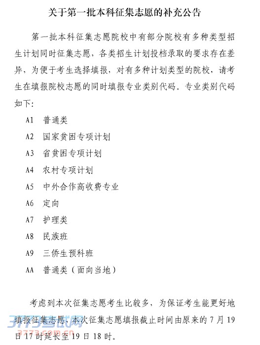 关于第一批本科征集志愿的补充公告