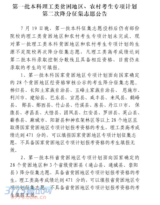 第一批本科理工类贫困地区、农村考生专项计划第二次降分征集志愿公告