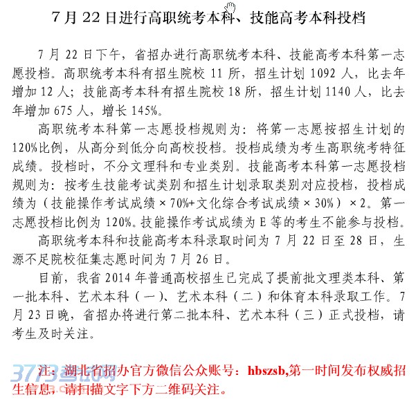 2014湖北高考一本理科专项计划第二次降分征集志愿公告