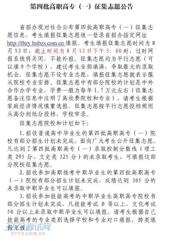 2014湖北高考提前批专科院校第二志愿投档分数线