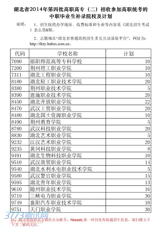 2014湖北高考招收参加高职统考的中职生补录院校及计划