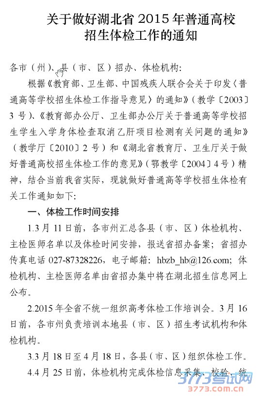 2015湖北高考体检工作的通知