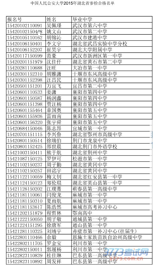 中国人民武装警察部队学院2015年湖北省参检合格名单
