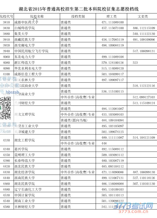 湖北省2015年普通高校招生第二批本科院校征集志愿投档线