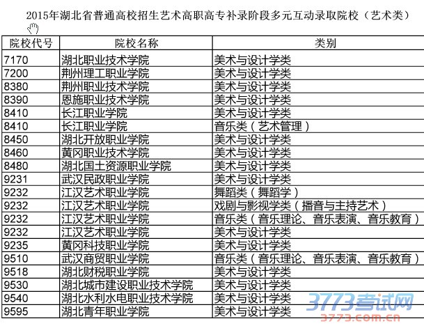 2015年湖北省普通高校招生艺术高职高专补录阶段多元互动录取院校(艺术类)