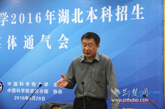 图为:中国科学院大学副校长、湖北招生组组长杨国强介绍情况。