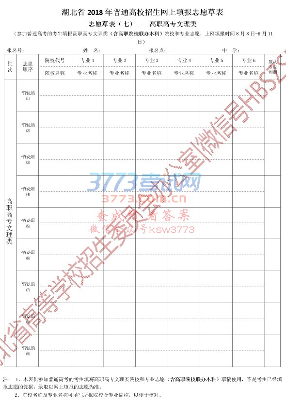 湖北省2018年普通高校招生志愿草表填写说明