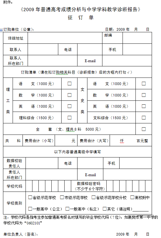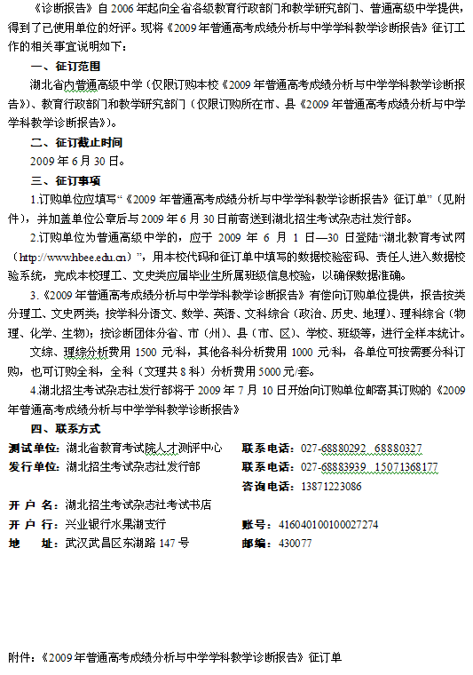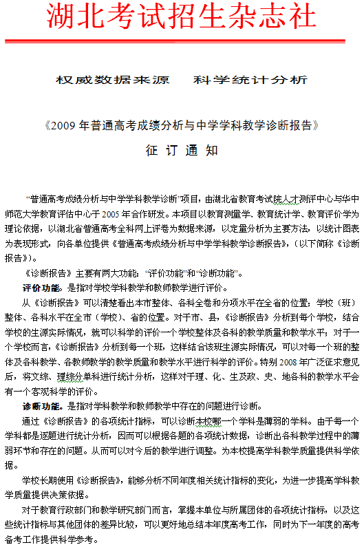 湖北2009年普通高考成绩分析与中学学科教学诊断报告征订通知