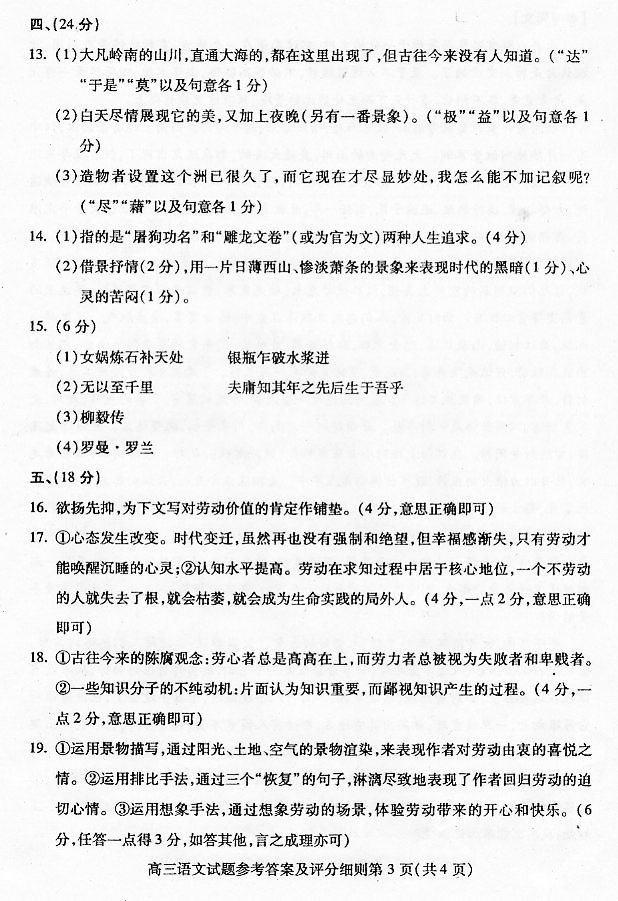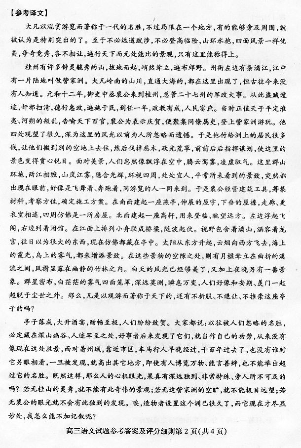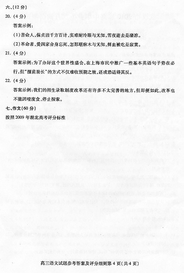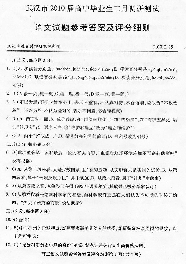2010年武汉市高三二月调考试题参考答案及评分细则公布