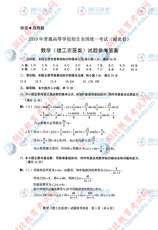 2010年湖北高考试题答案语文英语数学理综文综合