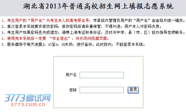 湖北省2013年普通高校招生网上填报志愿系统1、考生用户的“用户名”为考生本人的高考报名号,市县招办管理员用户的“用户名”由省招办统一编发。