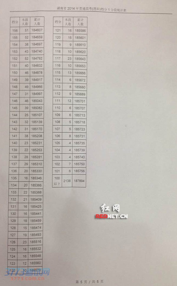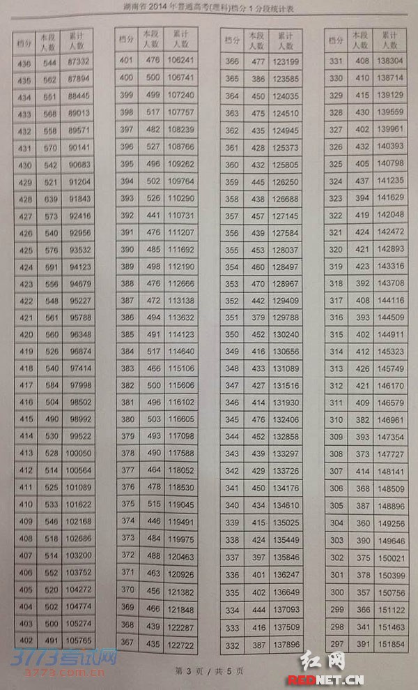 2014湖南高考理科档分一分一段统计表