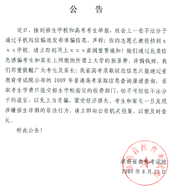 湖南省教育考试院关于手机短信诈骗的公告