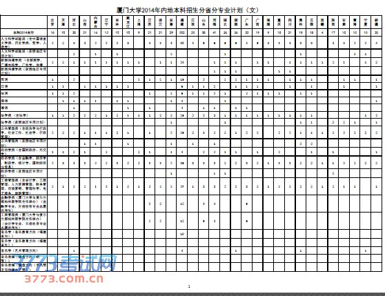 厦门大学2014年本科招生分省分专业计划