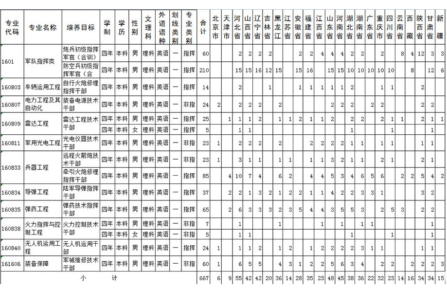 2.军械工程学院军队指挥类专业培养目标为炮兵初级指挥军官,在陕西的招生计划中,有10名从西安市八一民族中学招生,学员毕业后分配到驻疆部队工作。