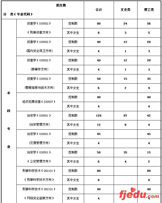 2008年福建警察学院(公安本科类)招生计划表