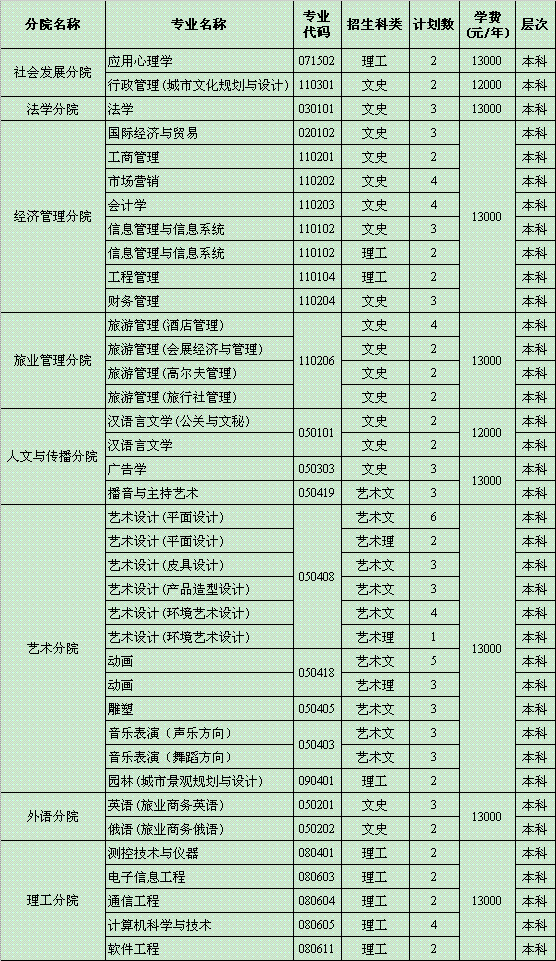 海南大学三亚学院2009年江西省分专业招生计划