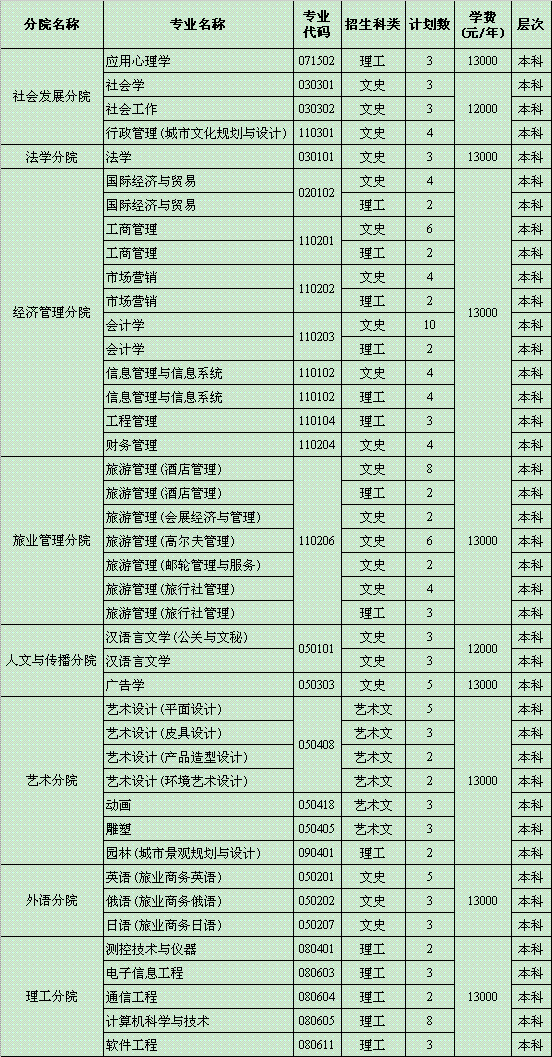 海南大学三亚学院2009年辽宁省分专业招生计划
