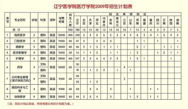 辽宁医学院医疗学院2009年招生计划表