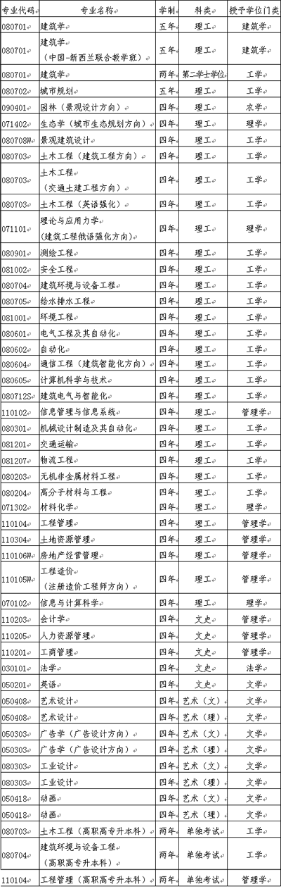 其他说明:英语专业和土木工程(英语强化)专业在招生录取时参考英语成绩。建筑学、建筑学(中国-新西兰联合教学班)、城市规划、园林(景观设计方向)、景观建筑设计、生态学(城市生态规划方向)等专业,要求考生须有一定的绘画基础。对于上述专业录取的考生,入学后加试美术,不合格者在校内进行专业调整。